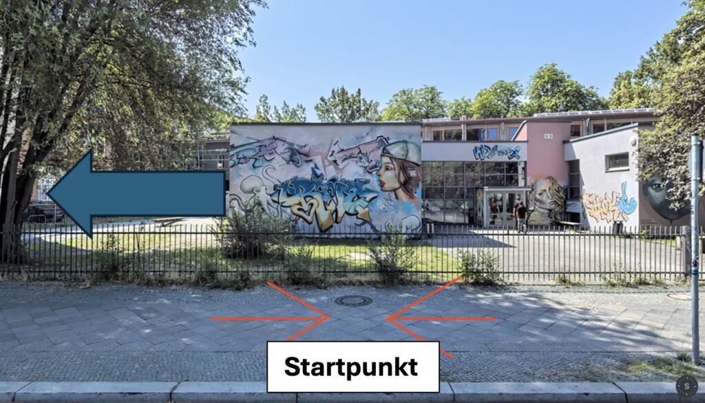 - Starte die Audiowiedergabe, folge den Anweisungen und gehe in Richtung Großbeerenstraße (Blauer Pfeil auf dem Foto).